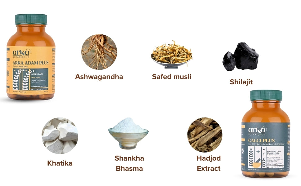 Support your overall well-being with the Adam+ & Calci+ Ayurvedic combo, designed specifically for men's health. Adam+ provides a blend of Ayurvedic herbs and essential nutrients for daily vitality and energy, while Calci+ delivers natural calcium and vitamin D for strong bones and healthy muscle function. This powerful Ayurvedic duo promotes optimal health and wellness naturally.