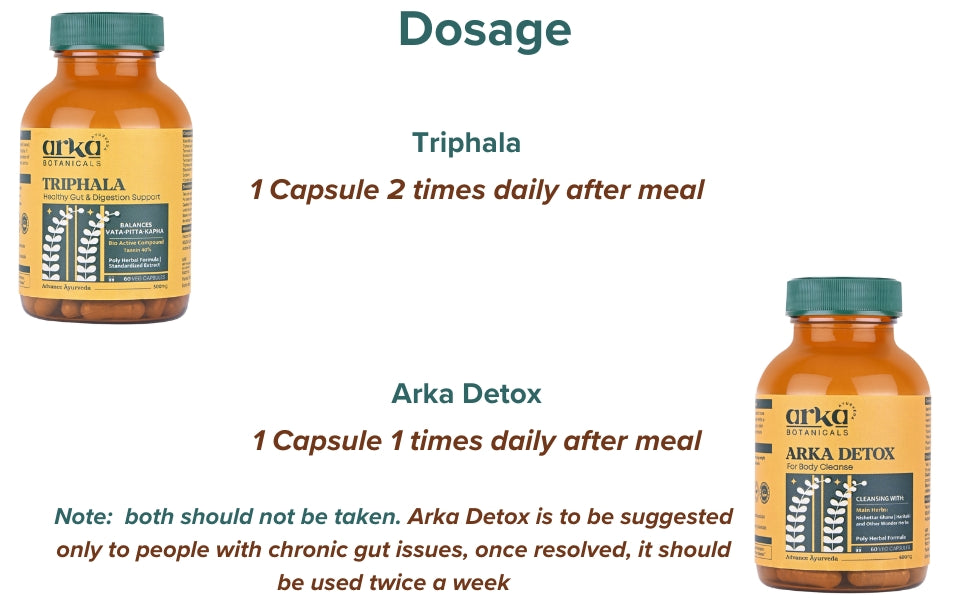 Take Arka Triphala at night with warm water for digestion and gut health. Use Arka Detox in the morning for a gentle detox and energy boost. Follow the dosage instructions on the label.