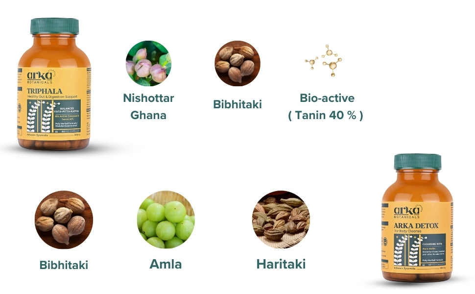 Arka Botanicals Gut Wellness | Arka Triphala - Amalaki, Bibhitaki, Haritaki Helps In Supports digestion, boosts immunity. Arka Detox | Herbal detox blend - Enhances liver function, Flushes toxins, and promotes energy.